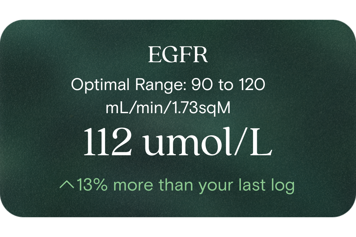 eGFR reflects how well your kidneys are supporting your body’s metabolic functions, including waste removal, fluid balance, and nutrient regulation. Tracking it over time helps you understand how your lifestyle impacts internal systems related to energy and metabolic health.