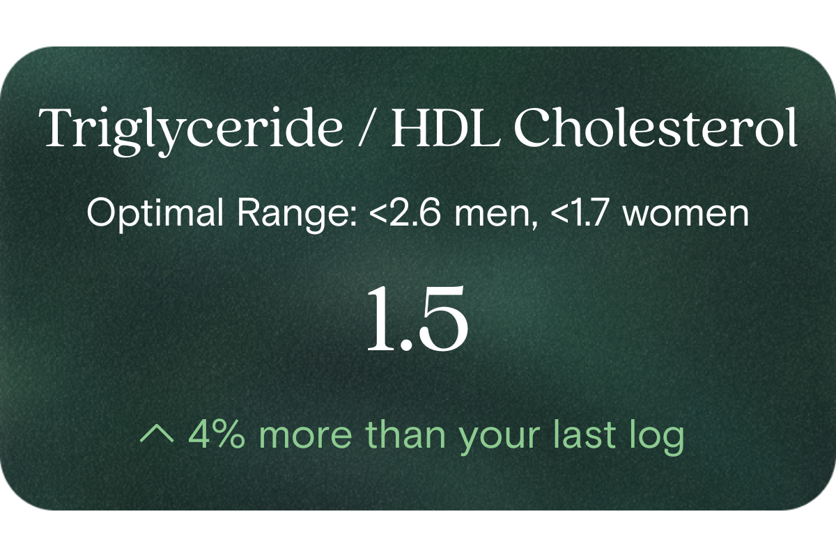 While the individual levels of triglycerides or HDL-C are informative, the ratio gives a clearer picture of underlying lipid transport-metabolism dynamics and how they tie into key long-term health performance variables. Elevated Tg/HDL ratios have been shown to correlate with features of central fat accumulation, insulin-resistance patterns and metabolic dysfunction — all of which influence how well your body maintains cellular energy, recovers from stress, and sustains vascular/metabolic resilience.